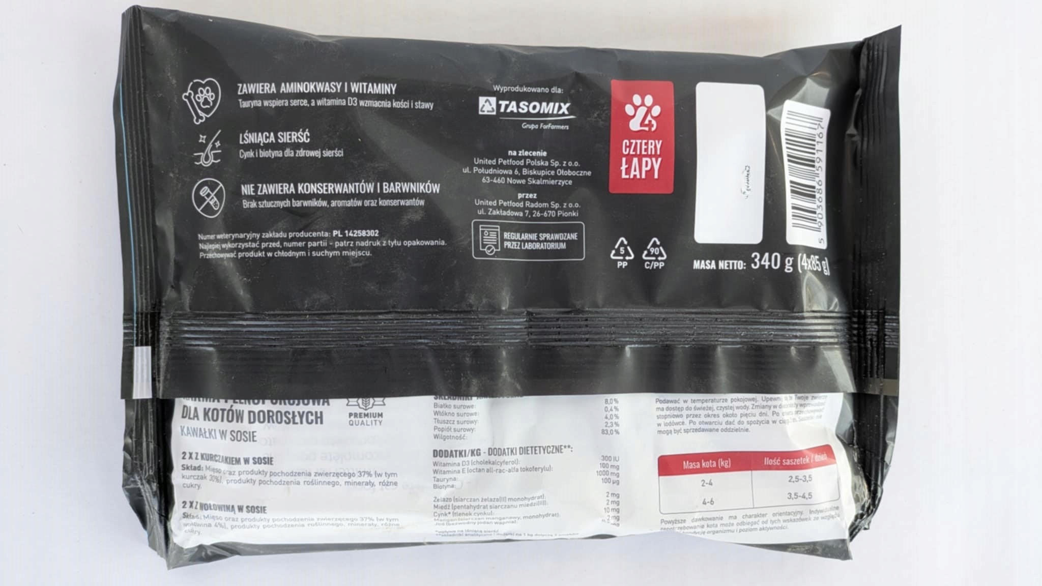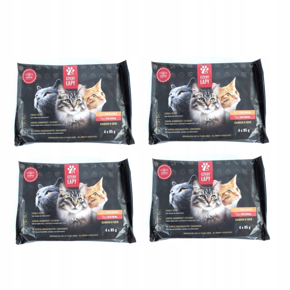 Cztery Łapy w saszetkach to pełnoporcjowa mokra karma dla kotów dorosłych zapewniająca optymalną ilość składników odżywczych, witamin i minerałów, niezbędnych dla zachowania zdrowia, energii i dobrej kondycji Twojego Pupila!