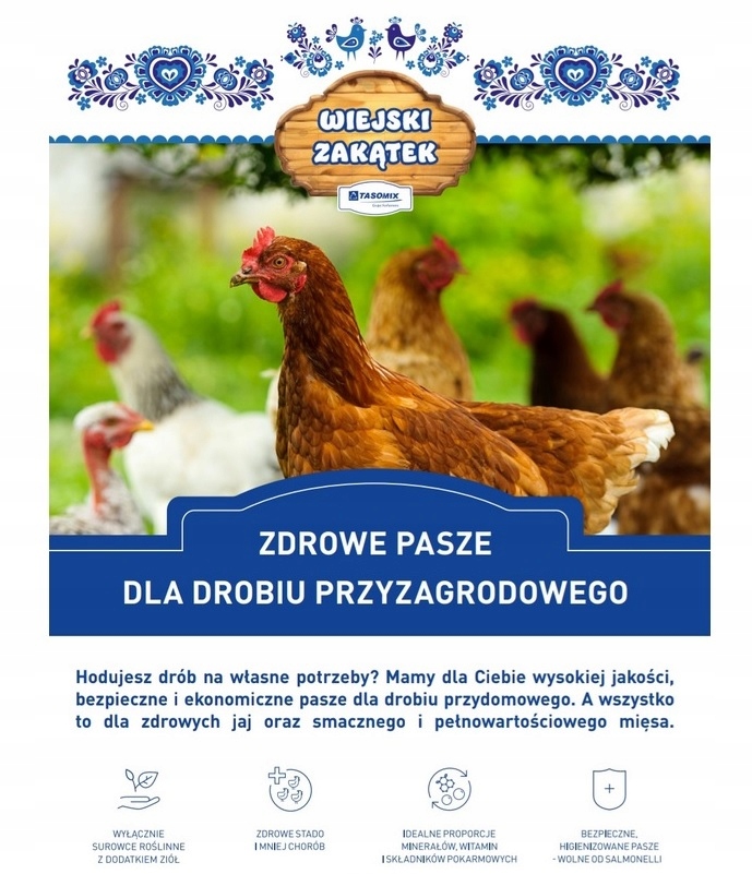 Pasza „Wiejski Zakątek” oparta jest wyłącznie na naturalnych surowcach z dodatkiem prozdrowotnych ziół: kurkumy, gorczycy i tataraku. Dzięki optymalnej dawce witamin oraz mikro- i makroelementów doskonale uzupełnia pasze gospodarskie.